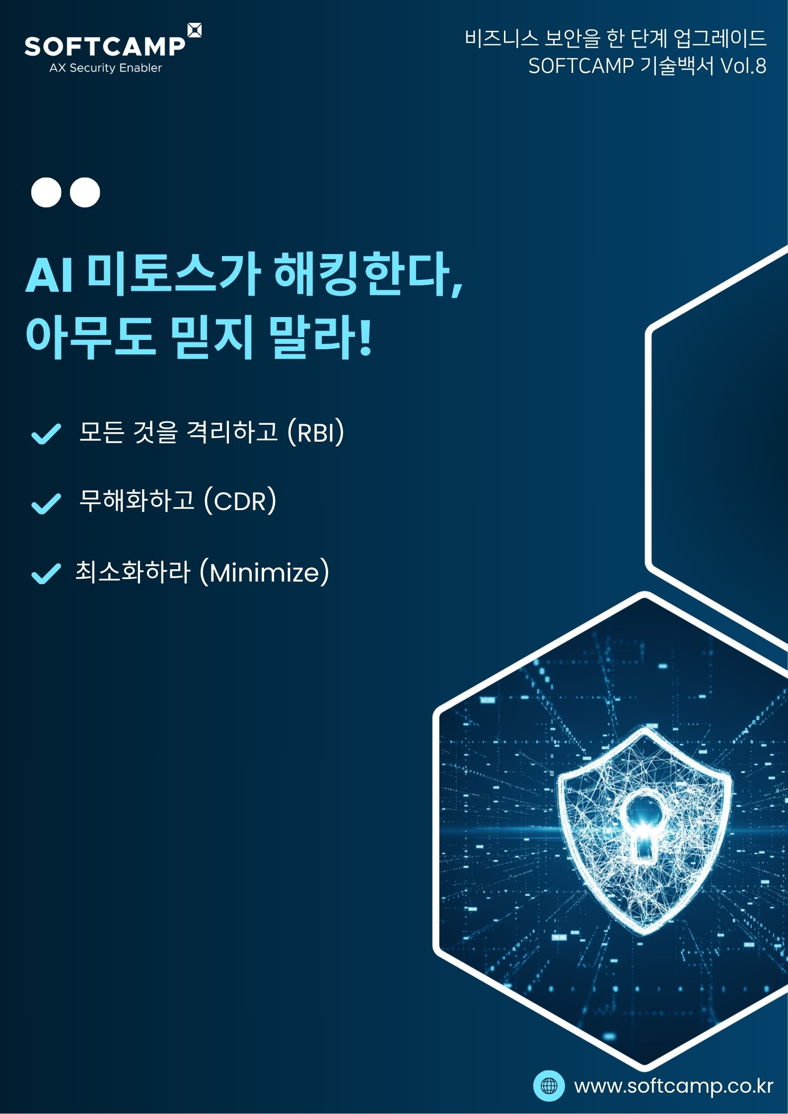 본 백서에서는 AI 기반 사이버 위협이 왜 기존의 탐지 중심 보안으로는 충분히 대응하기 어려운지, 그리고 한국의 보안 현실이 어떤 상태에 있는지를 진단했습니다. 아울러 이 환경에서 요구되는 새로운 방어 철학인 격리, 무해화, 공격 표면 최소화, 이 세 가지 원칙을 소개했습니다.